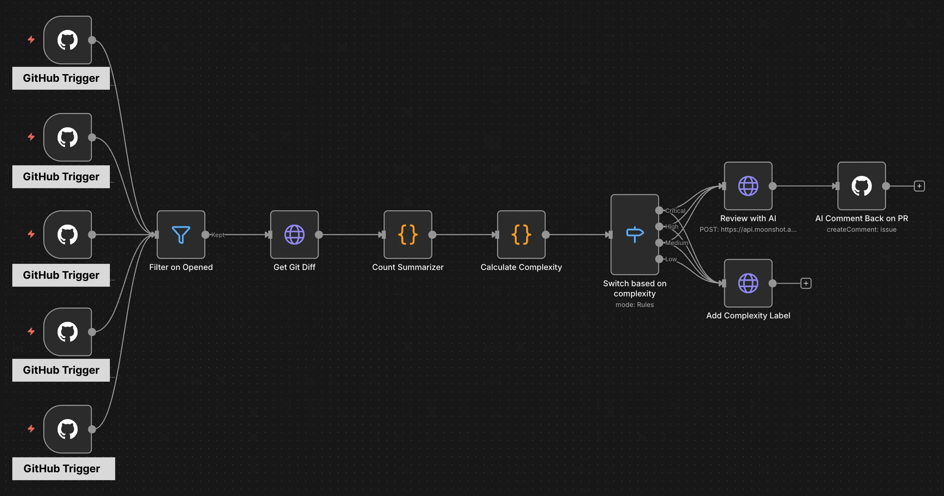 0. (Trigger): เมื่อมีคนเปิด PR มา / Rebase Branch1. ดึงข้อมูล `git diff`2. คำนวณความซับซ้อน (Pull Request Complexity Calculation)3. ติด Label ใน GitHub4. ส่งไปให้ AI สรุป5. เอาสรุปจาก AI มา Comment กลับใน GitHubซึ่งนิลก็กลับมาคิดอีกทีว่า ถ้า PR เล็ก ๆ แล้ว นิลก็ไม่ต้องพึ่ง AI นี่นา นิลก็เลยคิดว่านิลจะส่งให้ AI ต่อเมื่อ PR นั้นขนาดกลางขึ้นไป นั่นคือ Complexity มากกว่า 300 ครับ ซึ่งน่าจะช่วยลดค่าใช้จ่ายให้นิลได้